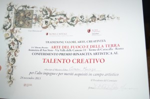 Il Centro Culturale Rinascita Artistica Onlus, presenta la XIV EDIZIONE della mostra premio ARTE DEL FUOCO E DELLA TERRA, incentrata sulla promozione dello sviluppo economico e all’ incremento delle attività produttive , per la valorizzazione e conoscenza delle tradizioni del territorio di un particolare segmento in materia di artigianato artistico a ROMA CAPITALE.