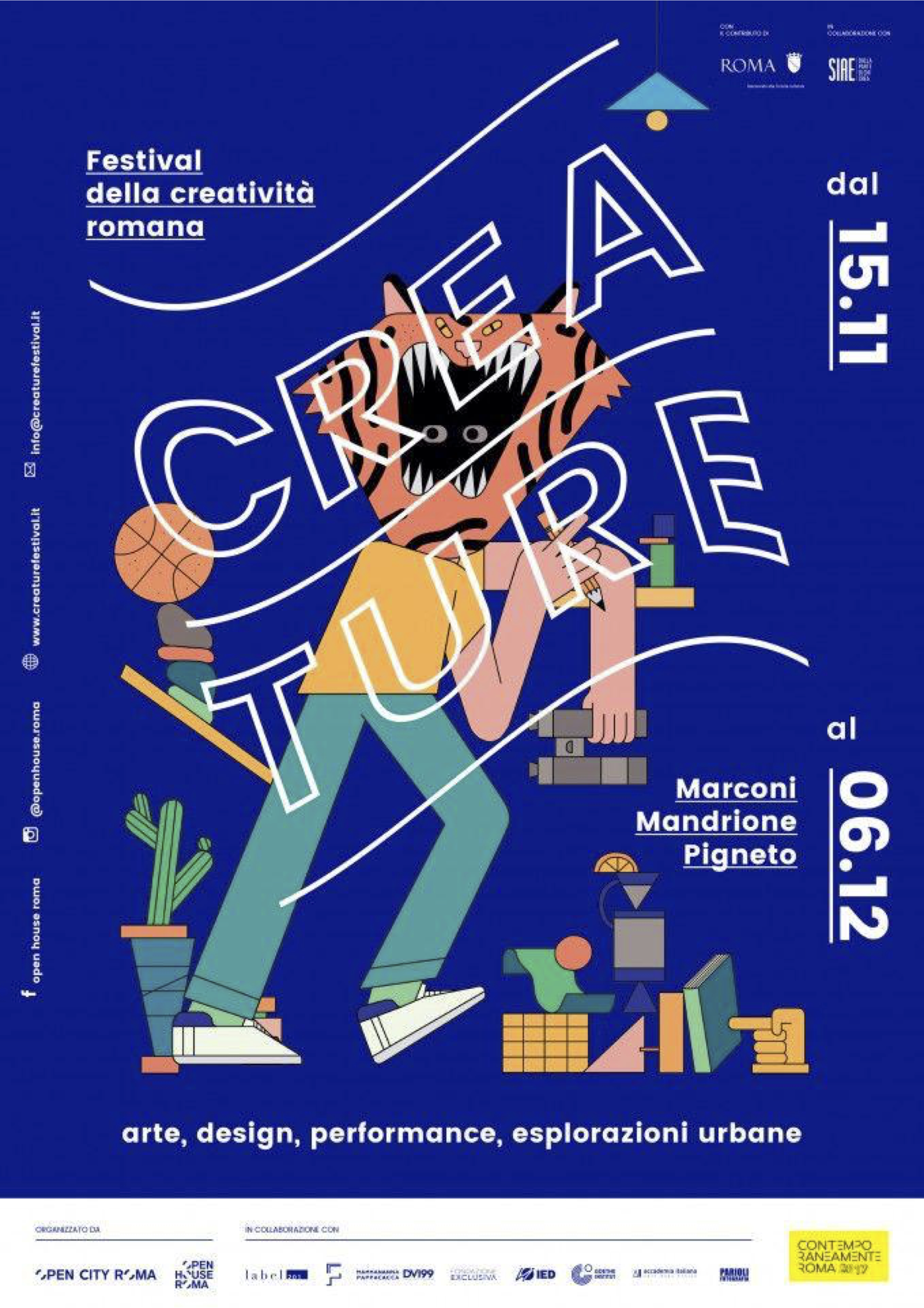 “Creature” è il Festival della creatività romana. Protagonisti i creativi e i loro luoghi di lavoro, espressione, sperimentazione. I° Edizione nei distretti del Mandrione, Pigneto e Marconi/Portuense dove lo spazio urbano viene contaminato da arte, design, fotografia, architettura, performance ed esplorazioni urbane. Creature è parte del programma di Contemporaneamente Roma 2017 promosso da Roma Capitale Assessorato alla Crescita culturale e in collaborazione con Siae. Tutti gli eventi sono ad accesso gratuito.